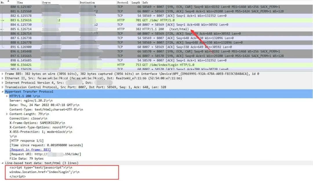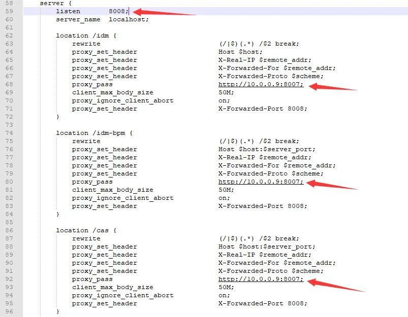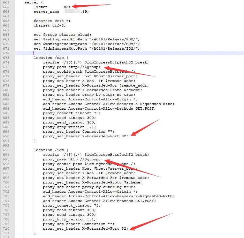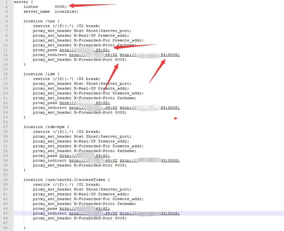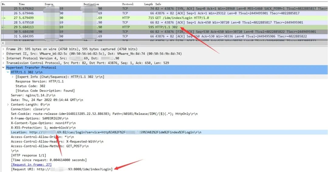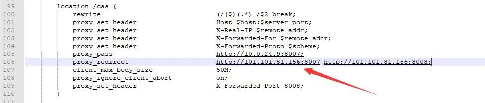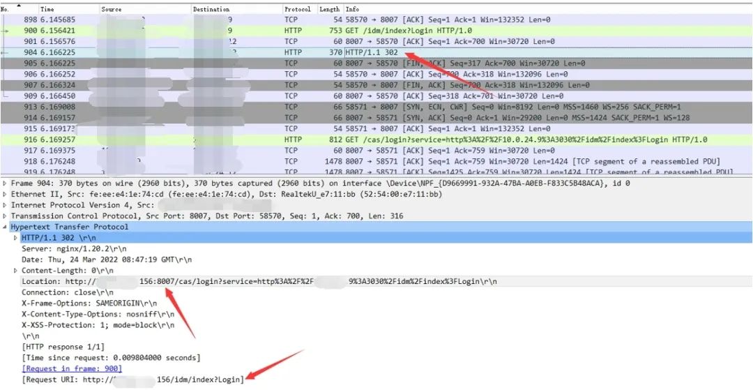 4.服务端响应,服务端返回时将8008端口改成了8007端口。经过Wareshake抓包测试,发现是由于CAS认证拦截跳转时,通过302永久重定向,拼接访问路径时在外网IP的基础上拼接了内网Nginx端口,从而导致地址访问异常。根据后端返回的信息,发现是由于服务端处理端口的问题,所以要进行端口处理,但根据Wireshake抓包测试,发现是由于服务端拼接了内网Nginx端口,而通过查找Nginx的相关配置,尝试通过proxy_redirect的方式实现外网Nginx的重定向,即内网返回response时,外网Nginx将ip和端口信息进行替换,替换为外网ip和端口。如图所示: