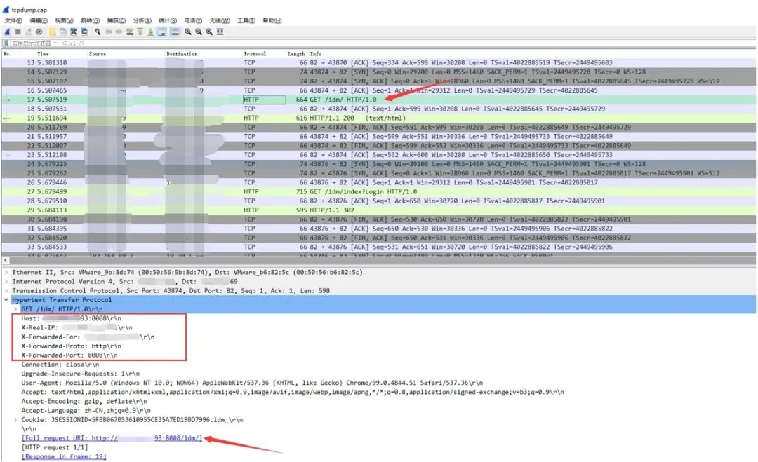 外网Nginx直接配置外网访问的代理端口8008,location中通过proxy_pass指向内网Nginx下的82端口,并通过proxy_redirect进行重定向,将内网的82端口重定向成外网的8008。注意:云平台模式和单据模式有一定不同,单据模式proxy_redirect时是将外网IP:内网Port重定向成外网IP:外网Port,但云平台需要内网IP:内网Port重定向成外网IP:外网Port,这个主要是由于内网的ingress-nginx做了处理,返回外网时是内网IP:内网Port。由于现场环境都是部署在Linux服务器上,而Linux服务器是无法通过Wireshake进行抓包分析,所以采用tcpdump进行抓包,并生成对应的文件,再将文件导入Wireshake进行分析。tcpdump命令:tcpdump -c 5000 -i ens33 host xxx.xx.xx.69 and port 22 -w opt/tcpdump.cap;解释:tcpdump -c 抓抓取数据包量 -i 网卡 host IP地址and port 端口 -w 生成的文件路径。