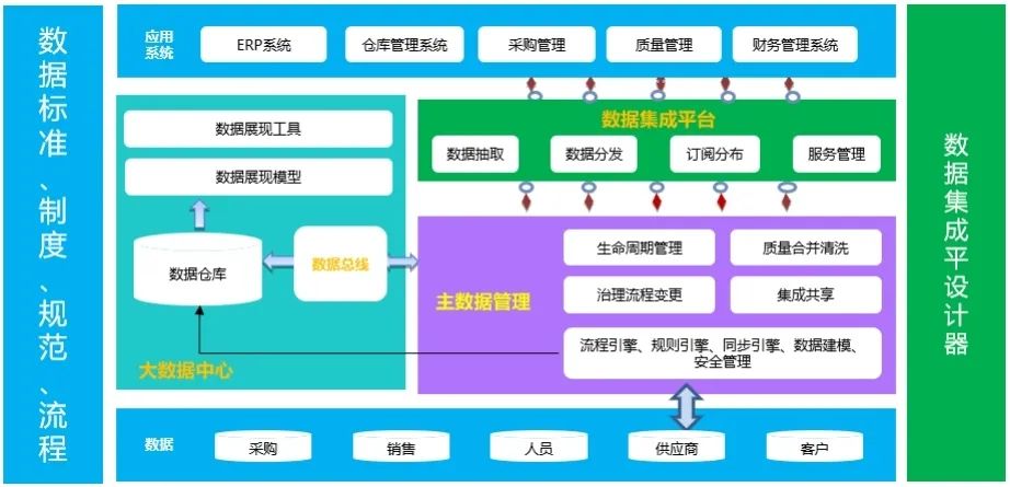 1.DAP数据分析平台:结合ESB从各系统进行数据抽取、加工、转换,并汇聚存储到数仓中,构建企业的大数据中心,基于数仓通过图形化、拖拽式配置构建分析主题,实现快速、精准分析,支持领导层的决策。2.MDM主数据管理平台:对企业中的主数据进行集中管理,统一进行清洗、校验和丰富,建立统一、标准、完整的主数据体系,并为其他系统提供标准的主数据,同时为DAP提供基础数据支持。3.ESB企业服务总线:从各个系统抽取主数据并同步至MDM平台,支持主数据校验、清洗和汇聚,并配合MDM平台进行主数据分发; 配合DAP平台建立业务数据同步流程,支持数据仓库的建设。本小节主要介绍三款产品之间的配合,数据中台集成方案如下: