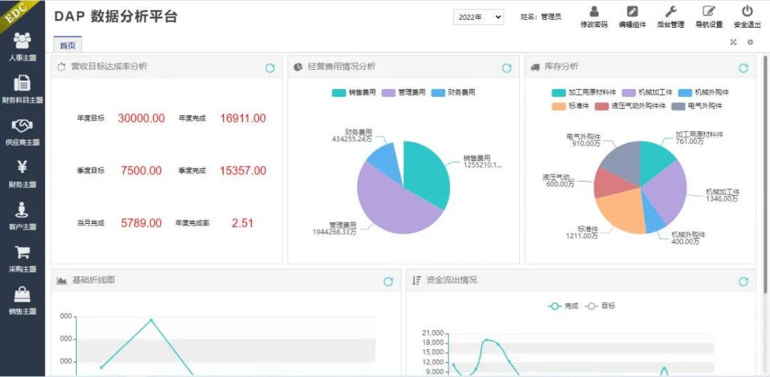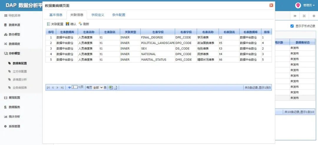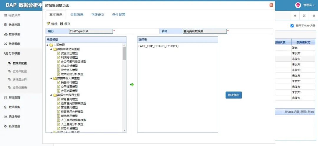 在数据分析时我们通常建议按照主题划分,例如销售主题、财务主题、人事主题等,而主题是跨业务系统的,接下来看一下各个主题,每个主题又是通过组件,例如条形图、柱状图、散点图、雷达图等进行可视化展示(点击各个主题)。主题可以进行条件穿透,任意组件可以通过点击跳转到二级看板或者三级报表,在穿透后会自动携带条件进行数据过滤展示(人事主题点击条件穿透展示),在穿透表格页面可以基于数据进行二次图表构建。DAP数据分析平台分析的数据更多是来源于各个业务系统,我们以人事主题的部分数据举例,有些静态数据是对基础人事信息进行分析,这部分的数据来源为MDM主数据管理平台,我们先登录主数据管理平台(登录主数据管理平台,在人员主数据新增一条数据,接下来在DAP调度模块进行任务调度,在效果展示页面进行刷新查看效果,已性别分析为例)。DAP数据分析平台还对企业运行情况配置各个大屏,例如经营大屏、项目大屏以及集团大屏等等,为企业提供运营决策,展示产品效率排行、营销能力排行、应收金额等等(展示大屏情况)。刚才看了DAP数据分析平台的展示页面,而展示的数据信息通常是从各个业务系统进行数据抽取加工展示的,数据来源主要包含业务系统的定义、数据库资源的注册以及ODS维表的构建,接下来对数据来源进行介绍。在数据分析过程中是从各个业务系统抽取数据的,而这些业务系统需要在数据分析平台进行业务系统的注册,配置业务系统的访问路径、访问密码以及IP地址等等。注册完成业务系统过后,DAP的数据采集分为两种形式,可以通过接口获取数据,同时也可以根据直接读取业务系统数据库获取数据,数据源头需要在DAP数据分析平台进行数据源头配置,只要是支持JDBC的数据库均可在DAP进行数据源头的注册,同时DAP系统内的数仓以及ODS也是在此处注册,通常是使用PostgreSQL。面向主题的数据运营层也叫ODS层,ODS层是最接近数据源中数据的一层,数据源中的数据,经过抽取、清洗、传输(ETL/ESB)装入ODS库。ODS的数据,总体上大多是按照源头业务系统的分类方式而分类的。一般来讲,为了考虑后续可能需要数据追根溯源问题,因此对于这一层不建议做过多的数据清洗工作,原封不动地接入原始数据即可,并且为数据拉取或定义时间戳,方便ODS-DW的数据增量同步。至于数据的清洗、去重、异常值处理等过程可以放在后面的DW层来做,从业务系统抽取到数据到ODS层通常是来筛选需要分析的数据表。在ODS数据定义模块可以通过读取模块注册的业务系统方式来创建对应的ODS数据表,在生成ODS模型后需要选择数据同步的策略,可以根据字段进行对比同步数据,同时也可以根据时间戳的方式获取增量的数据信息。数据分析平台的模型为两大类,一类是数据模型,另一类为分析模型,数据模型主要包含维表的配置、事实表的配置及模型的配置,并对指标进行集中管控,数据模型的构建主要是对ODS内的数据进行加工汇总。在进行数据分析前我们需要对分析的主题进行划分,通常来说企业常见的主题包括人事主题、财务主题、销售主题、生产主题、采购主题、成本主题以及各个行业领域的专属主题等等,在DAP数据分析平台划分的业务主题通常是跨业务系统。维度表属于数仓的设计范畴,维度表大体上分为两类,分为自然维度以及定义维度,自然维度是自然存在的枚举时间维度、地域维度、学历维度等是本身就存在的,例如在事实表中存在一个时间,现在我们要根据这个时间字段去汇总指标,这时一般有两种处理方式,第一是通过SQL的函数进行处理,第二是该时间关联时间维度表进行汇总。以数据中台POC财务科目为例,定义维表是根据业务系统进行划分的,每个公司都离不开财务方面,而钱一定是和财务挂钩的,在财务出纳时一定会关联财务科目,而企业总部和每个分公司的这个财务科目不一致就导致数据混乱的现象,所以我们根据业务需求定义财务科目这个维度表,使其公有一个黄金编码,维度表一般是有主键的。代表该类物质的一个单一个体,其他的字段一般都是有层次关系的,指标通常都是根据维度进行汇总计算,这样就统一了数仓数据的口径。在数据中台数据治理分析方案中的维度主要是来源于主数据管理平台,主数据平台负责维度的统一以及各组织、项目等维度之间的映射等,在数据分析平台可以使用导入的方式将主数据管理平台表的字段进行导入,形成对应的维度表,为后续数据模型的关联打下基础。事实表其实质就是通过各种维度和一些度量值指标的组合构建的,比如通过时间维度、地域维度、组织维度,而指标值是某人某时某地的一些实际发生的值。比如说2020年3月15日客户李枚支付定金5000元,这个金额就是指标,事实表的每一条数据都是几条维度表的数据和指标值交汇而得到的。事实表又分为两类,一是基础事实表(DWD),另一种是汇总的事实表(DWS)。基础事实表:对业务系统基础数据的外键进行处理,关联我们的基础数据,并对ODS的字段进行处理,并选取度量,主要是按照业务系统来构建。汇总事实表:汇总事实表是基于相同维度的基础事实表进行度量的合并,合并分为两种一种是汇总,汇总的过程中以时间维表进行关联,将基础事实表的时间进行汇总,对度量进行汇总求和或者求平均值,这种是纵向合并法。另一种是横向合并发,将基础事实表的字段