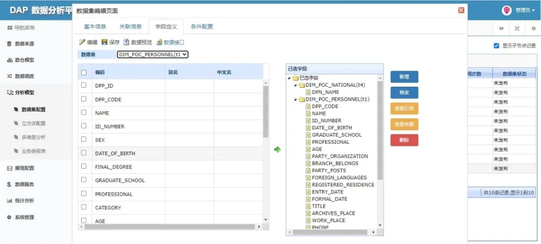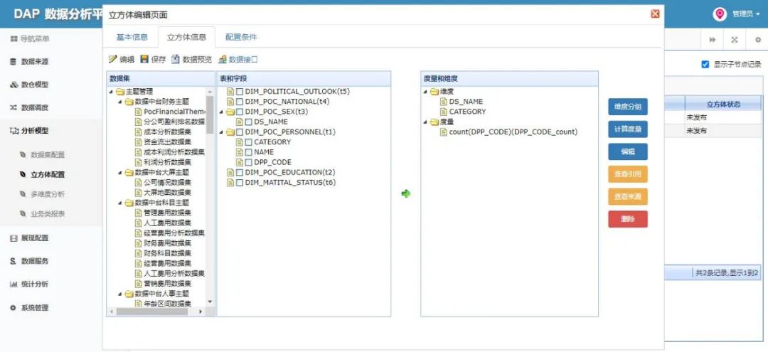 数据立方体允许以多维数据建模和观察,它由维和事实定义。维是关于一个组织想要记录的视角或观点。每个维都有一个表与之相关联,称为维表。事实表包括事实的名称或度量以及每个相关维表的关键字。以统计每个公司的人员学历情况为例,可以选择对应的数据集。