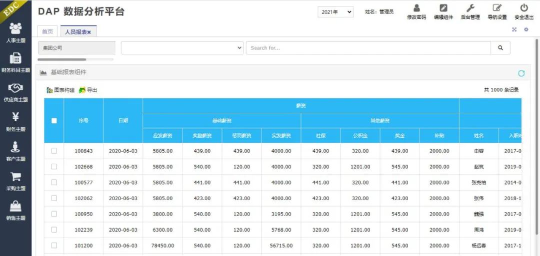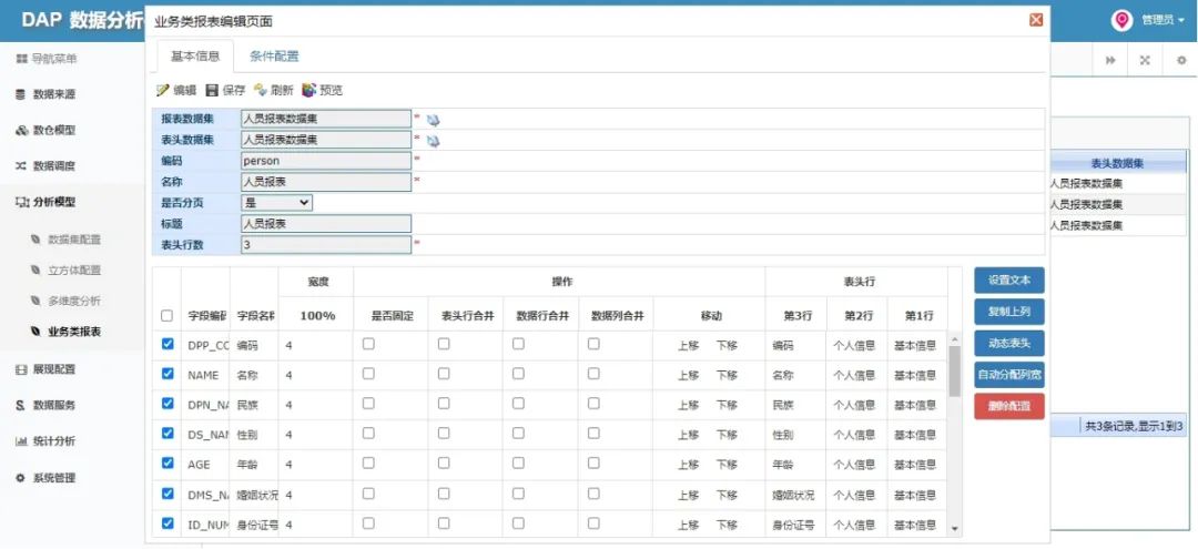 找到数据集中的表,按照指定的维度对指标进行分析,分析可以分为求和、平均值、计数以及最大值等计算,最后可以通过数据预览查看最终的效果。DAP数据分析平台综合业务报表主要是根据数据集为客户提供综合业务报表,其配置方法相对比较复杂,可以选择表头数据集以及报表数据集,综合业务报表通常是多表头的,效果如下: