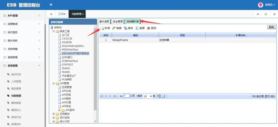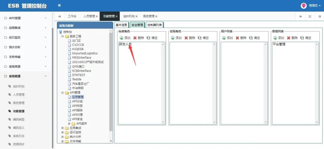功能授权统一按照ESB访问功能的角色进行实际授权,打开系统管理—功能管理模块,想让该角色能够访问哪个功能就对该功能进行授权即可,例如对API管理的应用管理模块进行授权,点击该模块,接下来点击安全管理进行授权,授权可分为标准角色、实际角色、用户以及群组,授权方式如下: