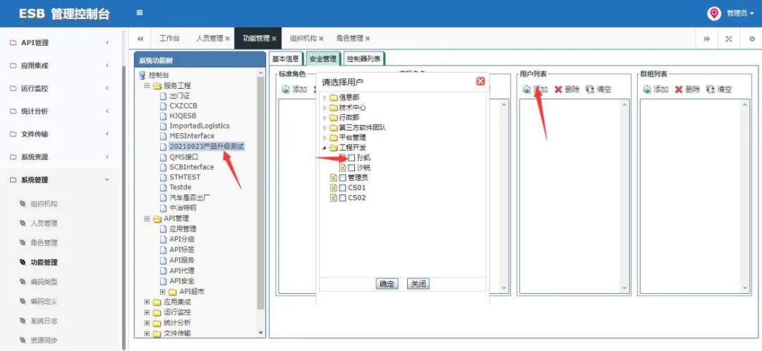 工程授权是对每个人自身创建的工程进行授权,注意本次授权不能按照标准角色进行授权,需要按照具体用户进行授权,使每个用户能访问自己创建的工程。在系统管理的功能管理模块添加实际的用户即可。