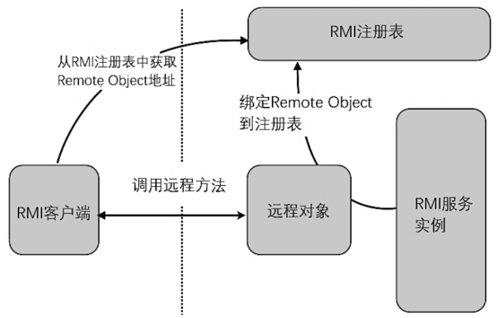 与一般的HTTP REST框架不同,一个可用的RPC架构不仅解决了远程调用问题,也提供了用于服务注册和服务发现的基础设施,比如RMI(Java语言的RPC)里的RMI Registry,如下图所示。