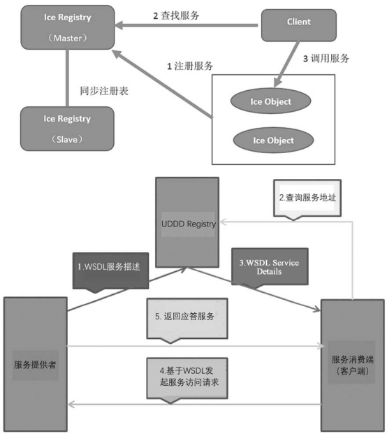 从RPC和COBRA发展而来的服务注册与服务发现模型,被后来者奉为经典。如下所示是ZeroC Ice的实现架构图,其中注册表实现了主从复制的特性,避免了单点故障。