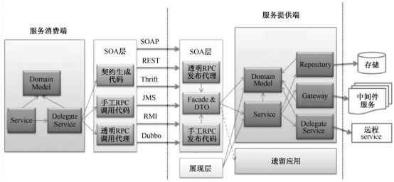 后来出现了SOA这个新概念,虽然业界对SOA这个概念有各种“诠释”,但“面向服务的架构”即以服务(Service)为中心的分布式架构深入人心,如下图所示是一个理想化的大一统的SOA架构蓝图,我们看到服务注册与服务发布模型及RPC技术依然是SOA的技术核心。