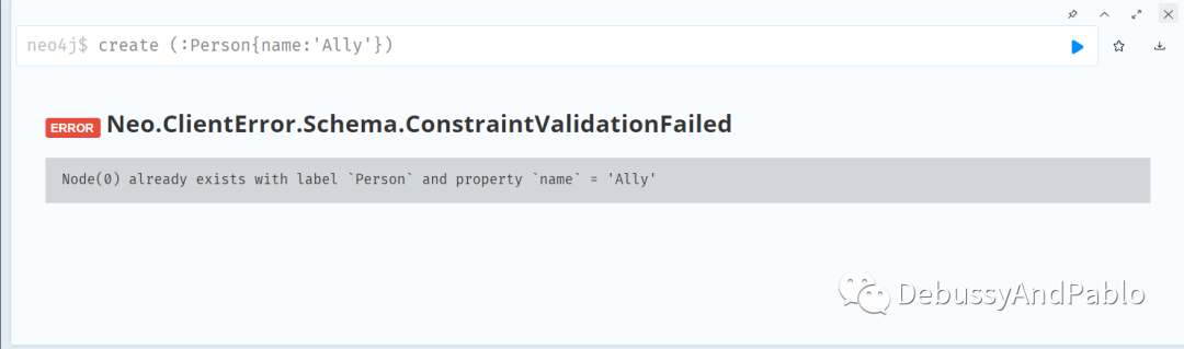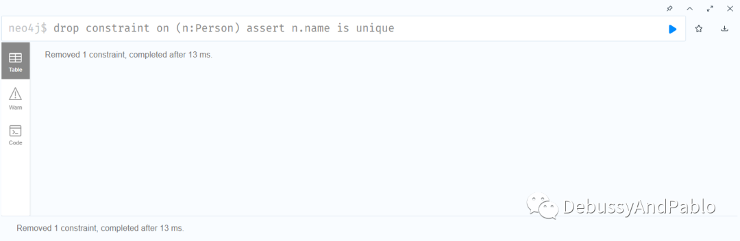 为:Person(name)建立一个独特的约束,禁止在Label person中出现同名的数据。但是因为之前我们建立了index,无法创建约束。所以只能先删除index再建立约束。