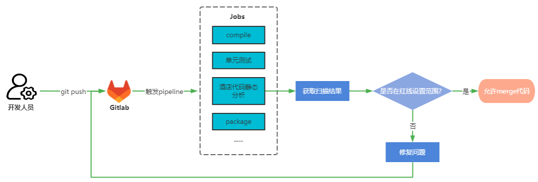 为了及时获得对提交代码变更的质量反馈,作为DevOps中重要的一环,Alchemy平台与Gitlab CI/CD相结合,将静态代码分析提前至开发提交或合并代码阶段。开发人员提交代码至Gitlab,触发流水线相关任务执行,任务执行完成之后可以对某些指标(如增量代码引入的空指针)设置红线进行卡点,如果指标在指定范围内,允许合并代码并发布,如果指标超过了红线设置范围,则不允许合并代码,开发人员修复问题后再次提交代码进行流水线的集成发布。扫描分析结果可以在Gitlab或者Alchemy平台上展示,帮助开发人员在快速迭代的同时保证代码质量。