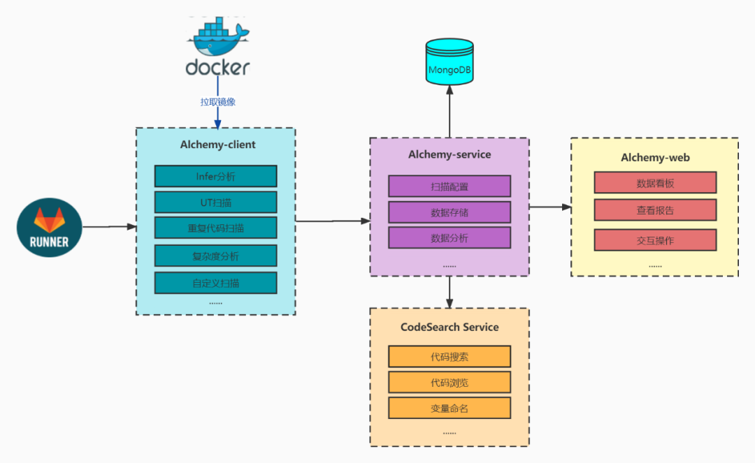 Alchemy平台包含Alchemy-client、Alchemy-service和Alchemy-web。其中,Alchemy-client为扫描脚本,包含Infer分析,UT扫描,重复代码扫描、自定义扫描等功能,集成到Docker镜像中,Alchemy-service提供数据存储、分析等后台服务,且依赖代码搜索服务CodeSearch-Service实现代码搜索功能,Alchemy-web负责页面交互。