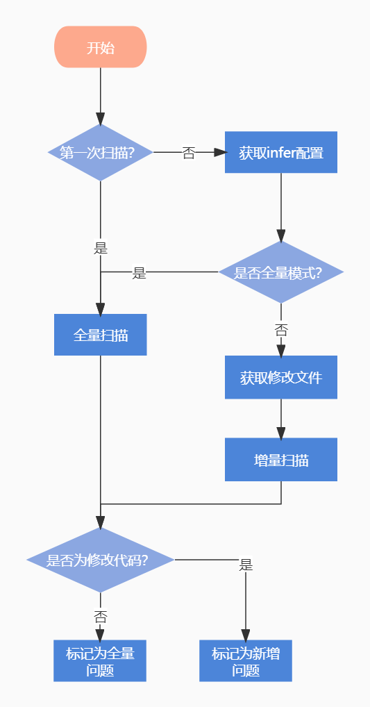 在分析过程中,首先判断是否为第一次分析,如果没有分析历史记录,则系统默认采用全量模式,否则需判断Infer扫描配置,若配置为全量模式,则分析此代码工程的全部文件,若配置为增量模式,需获取此次提交修改的文件列表,编译过程完成之后,在分析阶段指定文件列表进行分析。获取到分析出的问题列表后,判断问题所在的行是否为修改行,如果是,则记录为本次修改导致的新增问题,否则为历史遗留的全量问题。