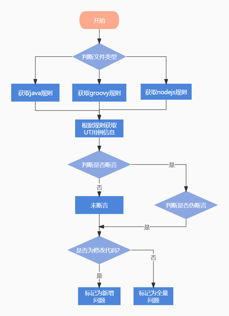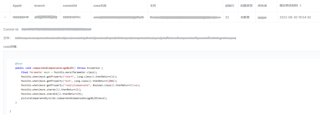 对单个单元测试文件的扫描流程如图。首先根据文件后缀判断语言类型,然后根据不同语言类型规则获取该文件中的用例信息,包含case名称、起止行、作者、最近修改时间、函数内容等,针对函数内容,先判断用例是否有断言,如果有,则判断是否为伪断言,如果未断言或者被判为伪断言,还需进一步根据用例的起止行,结合本次提交的改动信息,分析该用例是否为增量改动的用例,如果是则标记为增量问题,最后将结果推送给gitlab,在合并代码或发布时根据红线配置进行卡点。扫描结果如图所示。