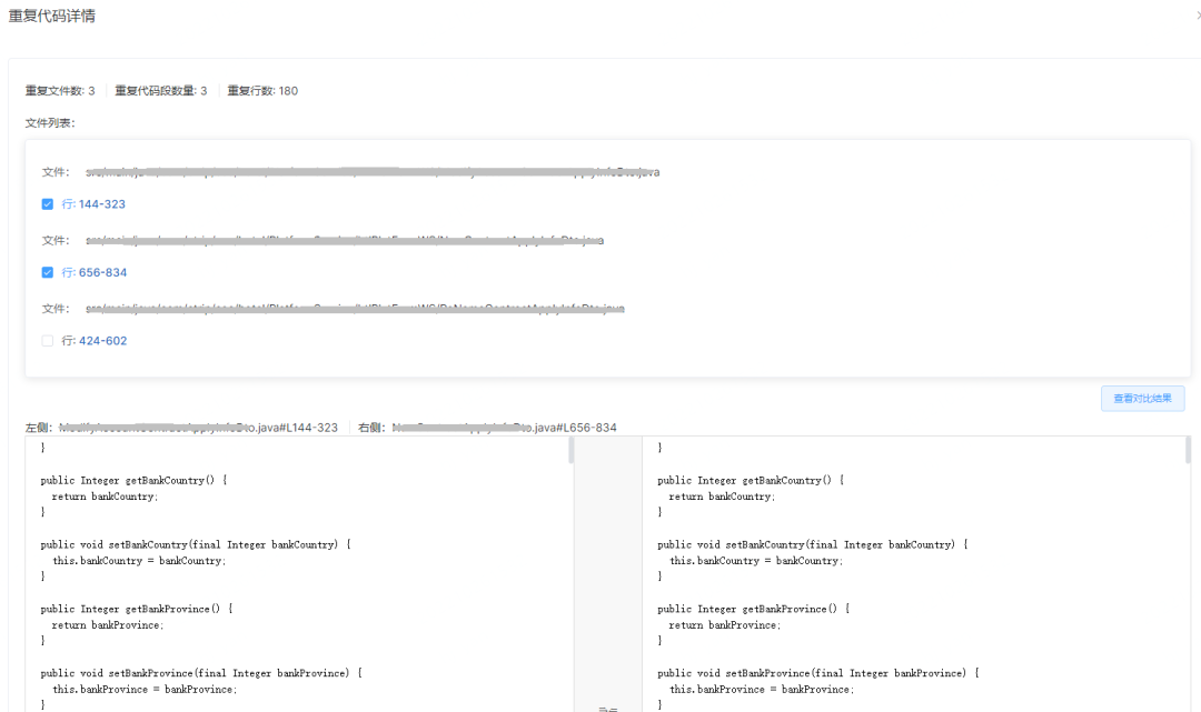 当前市面上有很多代码检测工具,如Simian,PMD-CPD,CloneDR等,由于在实现算法上有所不同,不同工具所能检测的重复代码类型也不尽相同。我们利用PMD-CPD扫描代码仓库,可以检测出单文件或多个文件中除了空格、注释、换行以及变量名以外内容完全一致的代码段信息,这些信息包含文件路径、代码段内容、起止行以及作者信息,详情结果如图所示。