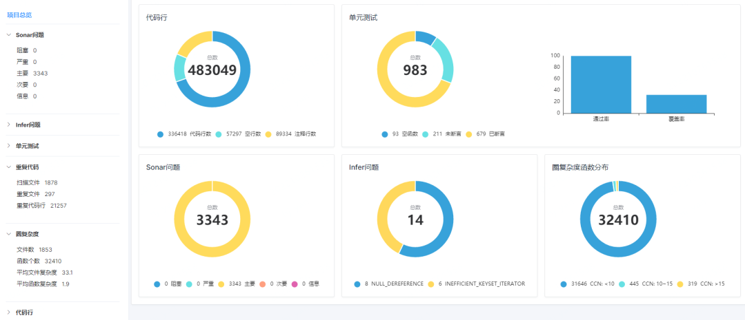 Alchemy代码分析模块可以对代码不同维度的指标进行统计分析,包括代码行、单元测试、infer问题、Sonar问题、重复代码、圈复杂度等。用户可以在代码分析页面查看各维度问题分布情况,从而对项目的整体风险指标进行更全面的分析,可以根据问题的严重程度设置优先级进行针对性的治理。