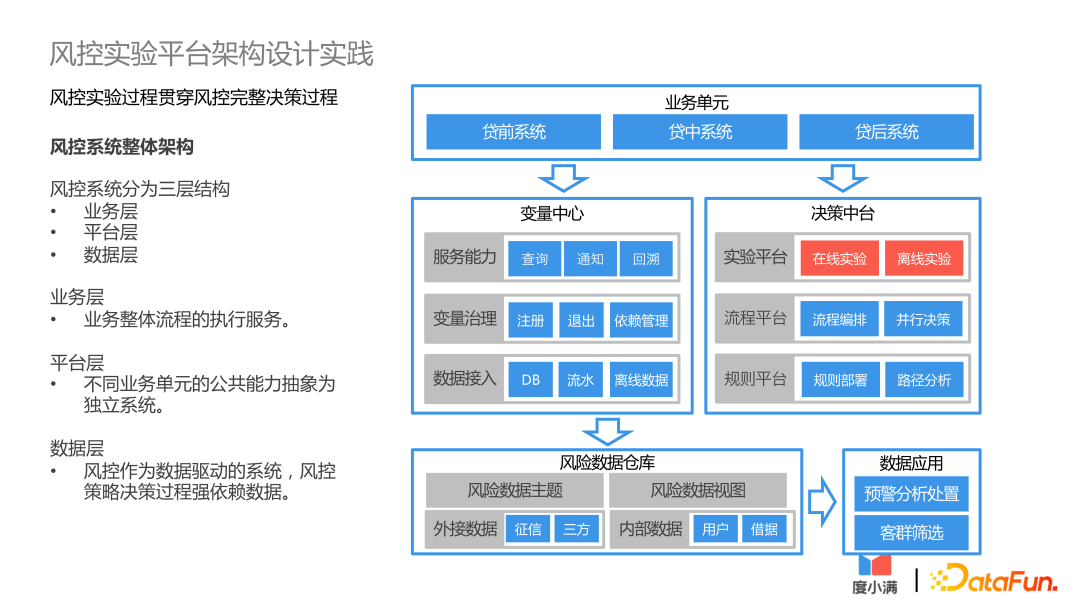 导读:大数据风控在互联网金融领域的应用已相对成熟,现在大多金融服务都已可线上进行,因此各个方面的风险控制更加信息化。风控系统的建立就是依赖于数据的积累做规则与分析,为风险控制提供更好的技术手段验证,而风控实验平台便提供了这样一个贯穿策略全周期的环境。今天度小满资深技术专家谭领航会和大家分享度小满风控实验平台的架构和实践。