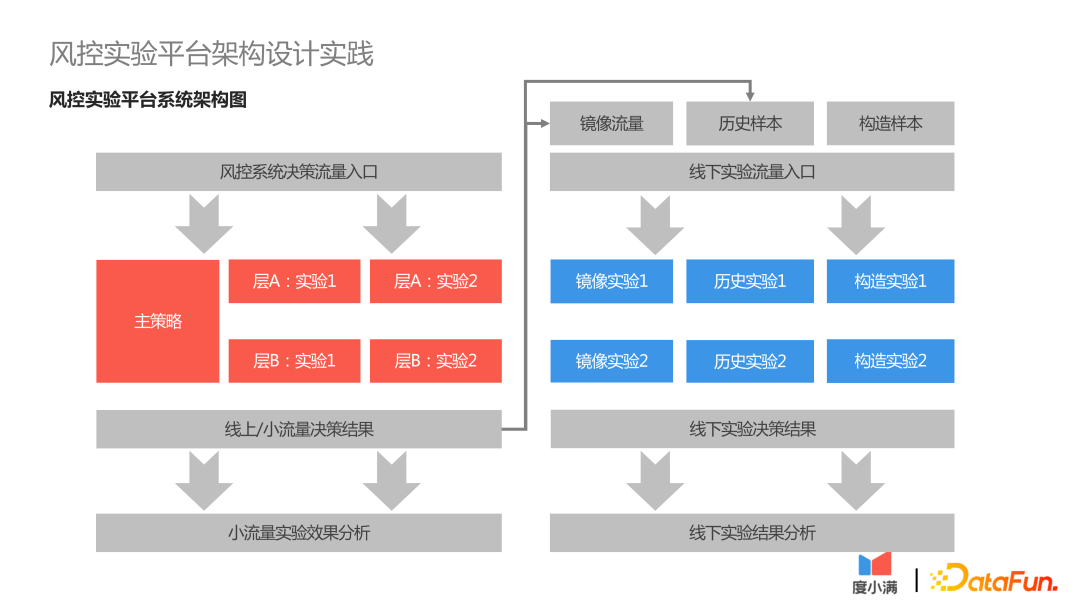 线上实验即通过决策平台流量直接流入实验平台,并进行将小部分流量流入相应的策略迭代实验中,进而获取相应的决策结果。