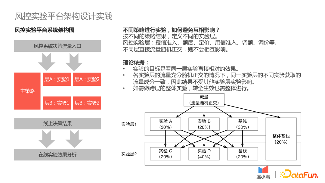 由于风控决策链条较长,链条中各个业务模块均可能存在相应的策略调整,所以在整个线上实验中,可以将每个实验层作为一个策略的迭代验证实验,倘若实验层之间的流量自上层流入下层时是随机正交的,获取的流量成分是一致的,则可以认为该实验层的实验结果与上层是相对独立的,不受影响的。