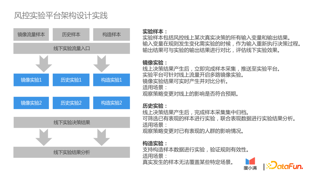 首先介绍一下实验样本,实验样本中记录了线上风控决策的所有输入变量和输出结果。输入变量可以在线下实验回放测试过程中重新作为样本进行输入,而输出结果则可与实验的输出结果进行对比,进而评估线下实验效果。线下实验均需要使用到实验样本。