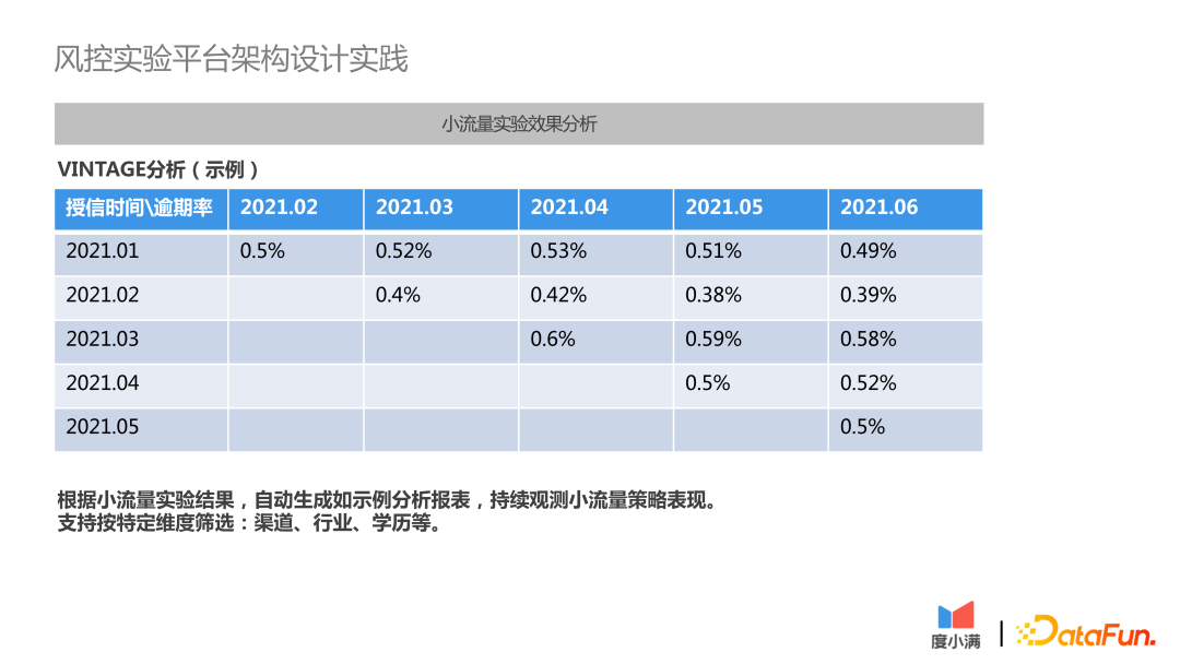 小流量实验是处于线上环境的实验,是直接对线上产生效果的,所以相关的分析方法也与线上使用的分析方法一致,举个例子,如图vintage分析,分析策略在不同授信时间变更后,准入后的客户在后续时间节点的逾期率表现;假设在某个时间节点做了策略的变更,依据此策略准入后的客户逾期率降低了,则可以说明该策略是有效的,而若逾期率升高了,则可以说明策略仍需要进行调整。
