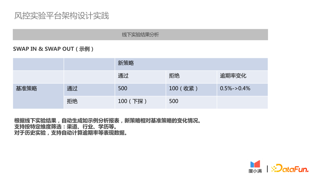 ③线下实验:配置相应的历史实验,并将已经回溯的样本数据输入,并通过线下实验进行验证,分析线下实验的结果,确认是否符合预期。其中用到了前述提及的SWAP IN & SWAP OUT方法,通过查看策略收紧及策略下探之后的逾期率变化与预期的偏离程度。例如原有用户为通过审核,但其在原有规则下一段时间后表现逾期,但在新规则下,用户被拒绝,则此策略的收紧是否正相关逾期率的降低。