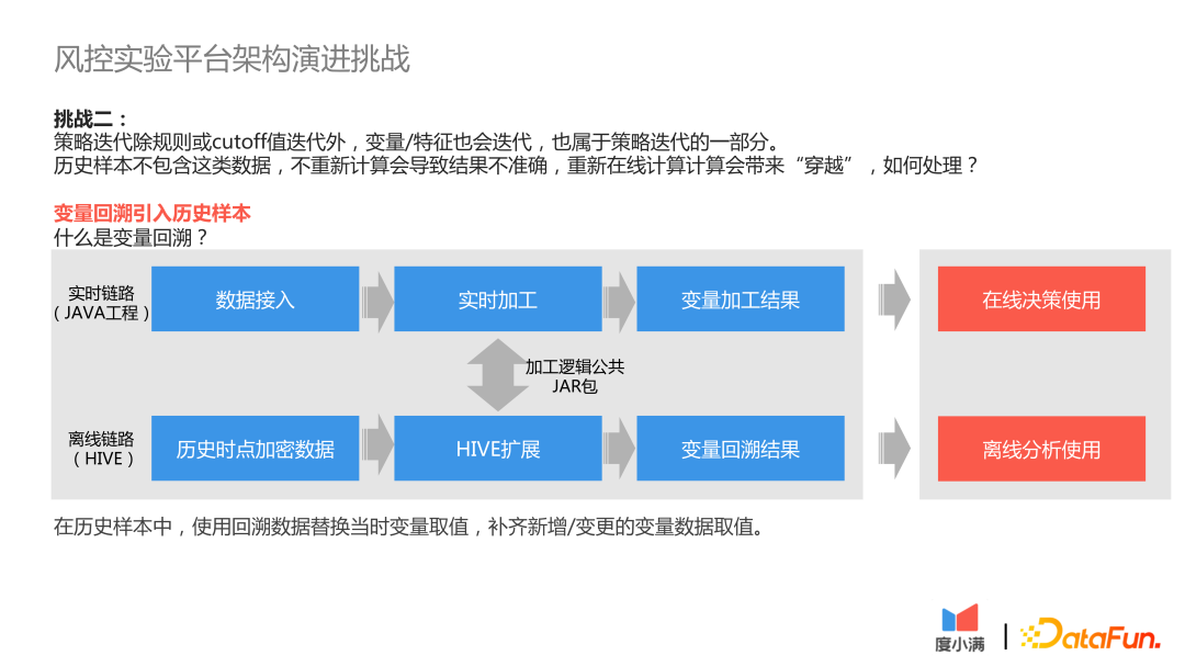 在风控架构中,一般都是先有在线处理,再有离线处理,相较于业界标准的批流一体处理,度小满实现线上线下一体打通是使用技术角度相对简便,成本较低的方式,即将实时加工链路中的公共加工逻辑进行抽象后,在离线链路数据加工做进行扩展,以进行变量的回溯。