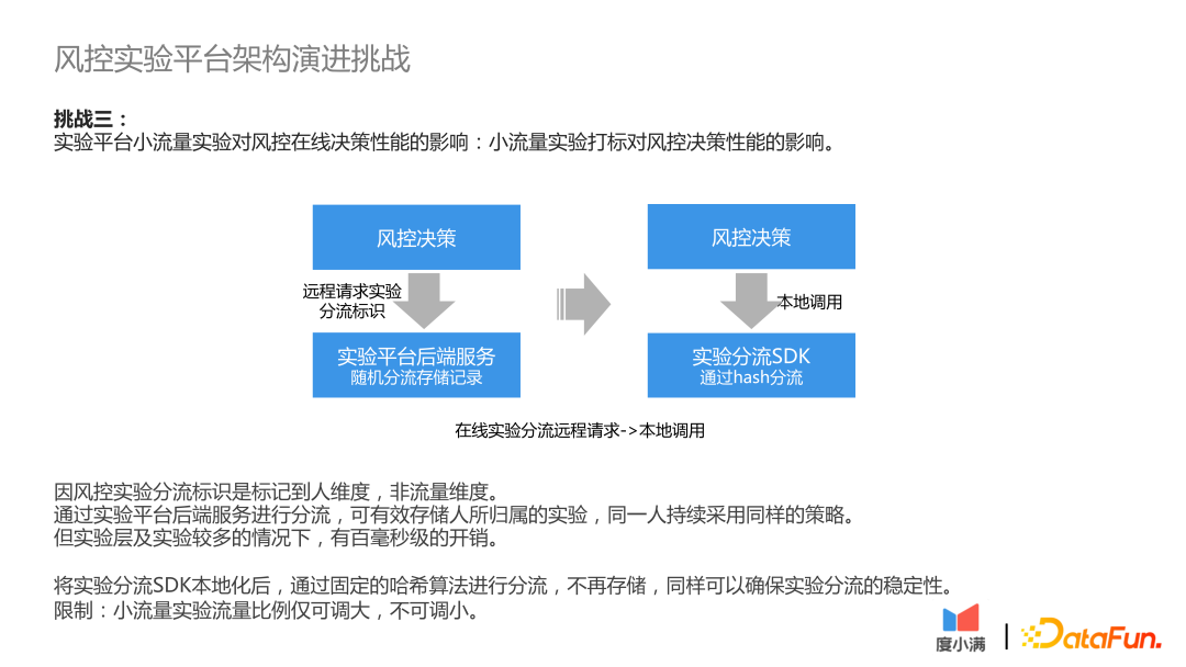 风控实验中,一般某用户被标记为了实验对象,则该用户多次操作贷款审批或额度评估等操作,均需要保证一致性。此时通过后端服务进行分流,存储用户所归属的实验,则可以对其持续采用相同的策略,而进行状态的存储。但若存在实验层或实验较多的情况,则会影响风控决策的性能,会存在有百豪秒级别的开销。