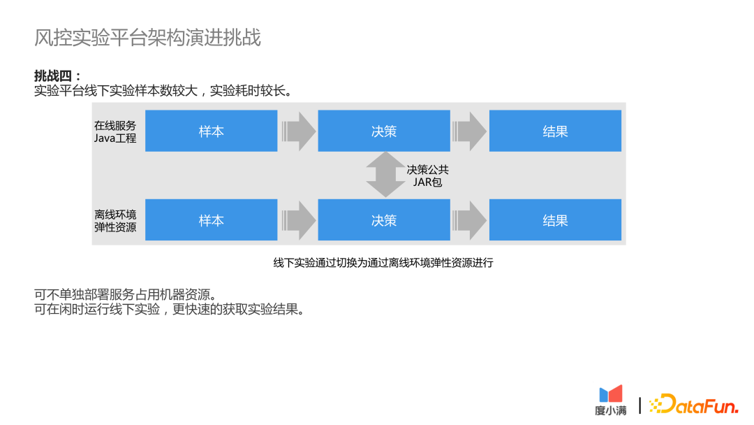 当实验样本数较大,计算繁琐,决策路径较长,导致实验耗时长时,这便需要利用到离线计算,其是实现方式和变量回溯类似,优点便是实验计算中不影响在线服务的性能且可以根据相应的实验进行弹性的资源分配。通过将决策内容(策略、规则等)抽象成公共JAR包,在离线环境模拟相应的决策过程,可以通过弹性资源轻松完成数百倍与在线环境的计算。
