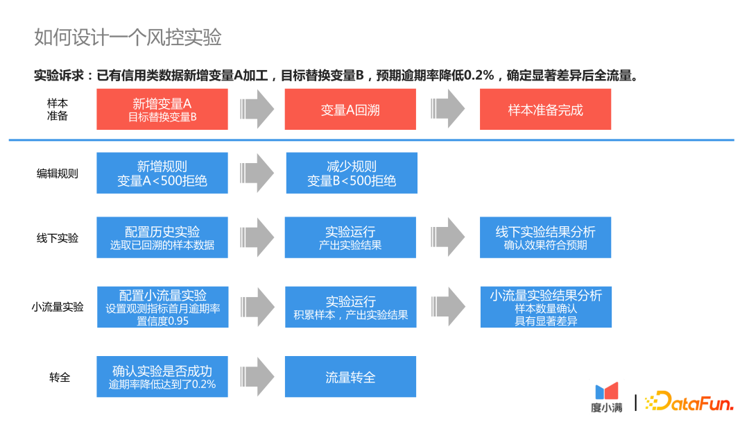 实验诉求:已有信用类数据新增变量A加工,目标替换变量B,预期逾期率降低0.2%,确定有显著差异后全流量。