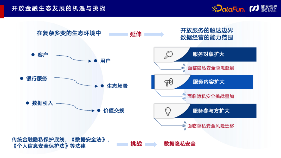 当我们的生态环境变得越来越复杂之后,随着服务对象、内容、参与方的扩大,必然会面临隐私安全隐患延展、隐私安全挑战叠加、隐私安全风险迁移等问题,这也对金融行业提出了更高的要求。
