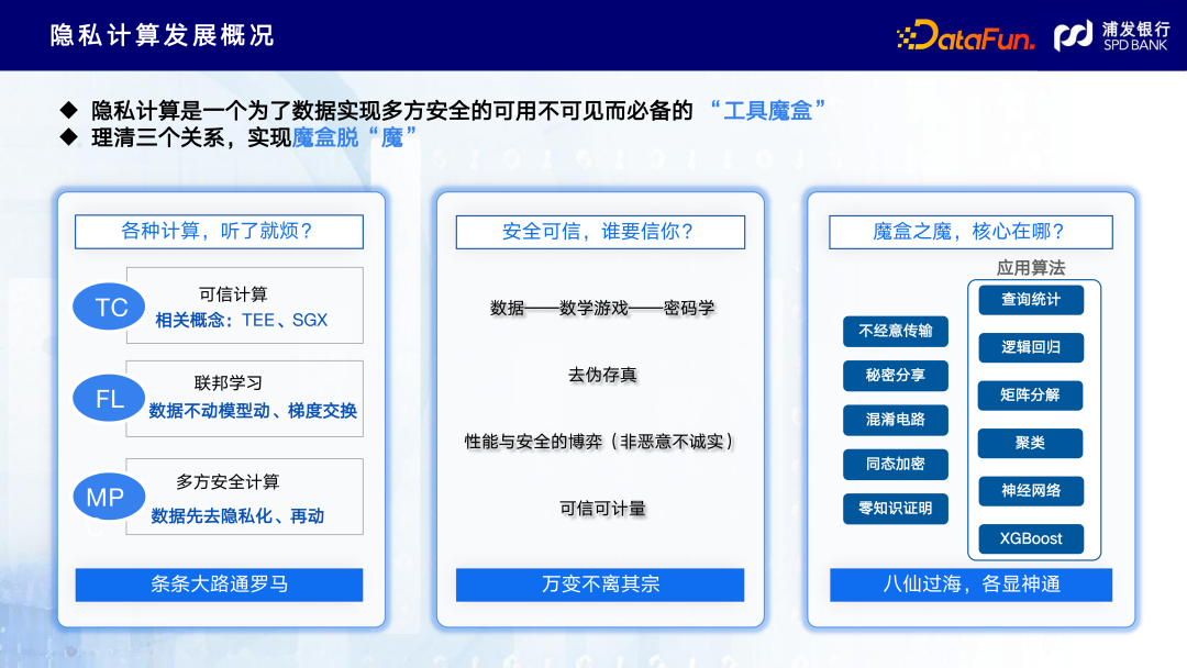 对数据的理解。当我们用传统的脱敏后的数据去撞库的方式,拿了几万条数据去和公安对接的时候,只对接了几条。因为公安的数据是上亿级的,一般银行是千万级的,所以样本的筛选很重要。另外在做三要素匹配的时候,我们只能用一些少量明文或者哈希的方式去做比对,因为要考虑到数据的安全性。从这个角度来说,如果没有隐私技术的支撑,我们可能很难去做数据的有效探索。理论上说,如果我们把所有敏感的数据基于密文方式去做计算,就可以有效提升数据应用的安全性。这就是同态加密的一种思路。但是把全量数据去做同态加密,然后再做PSI ,这是一件非常低效能高成本的事。我们更多的是用多方安全计算的方式去对各类算法数据做对齐,但它也有个前提就是双方之间都要部署 MPC 的节点。那这个时候整个的部署工作就会比较重。用哪一家的 MPC 是大家现在所关注的一个互联互通的问题。比如某几家运营商,可能用了自己的解决方案。例如FATE,或者自己的 MPC 平台。每家商业银行可能也有自己的考虑,那最终用哪一个方案,可能会存在着一个比较长的磨合、协商的过程。