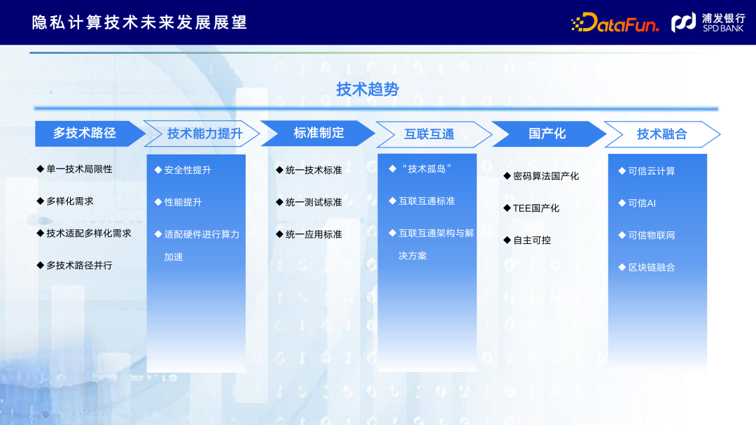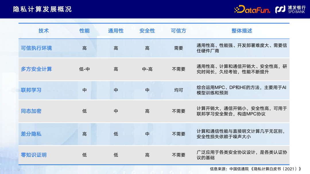 Q2:刚才您有个表格中列了很多的隐私计算技术,比如TEE、多方安全技术、联邦学习、同态加密等等都各有特点。那您觉得在银行体系,特别是浦发体系下,未来哪些技术可能会得到更多的使用?