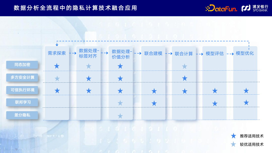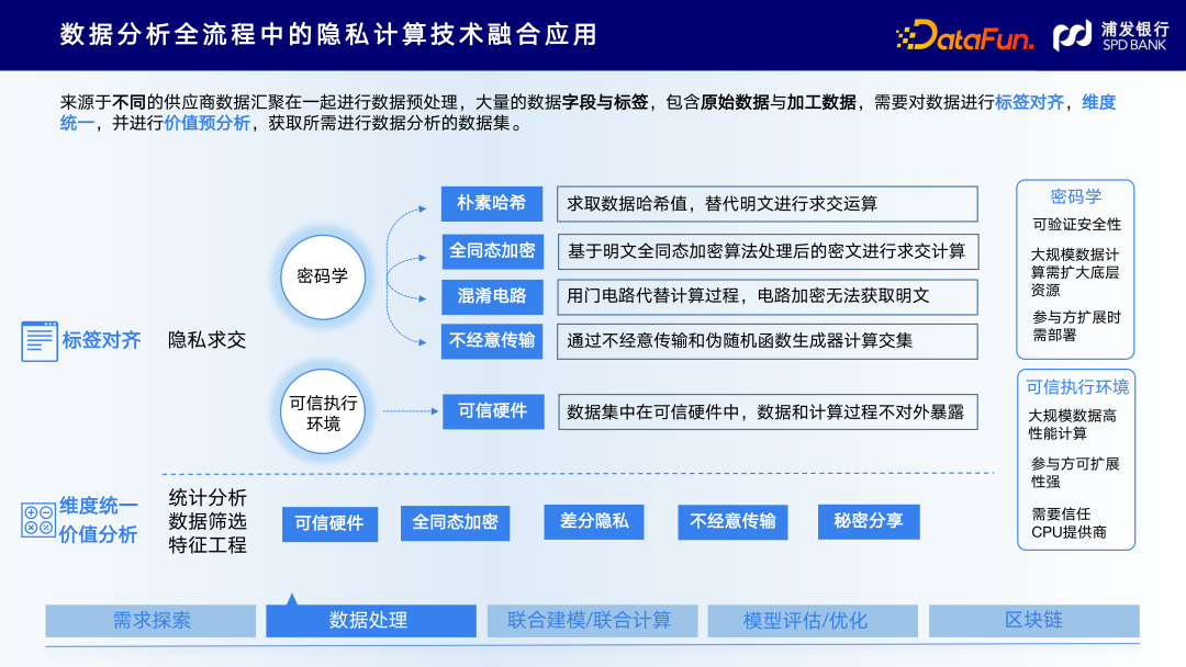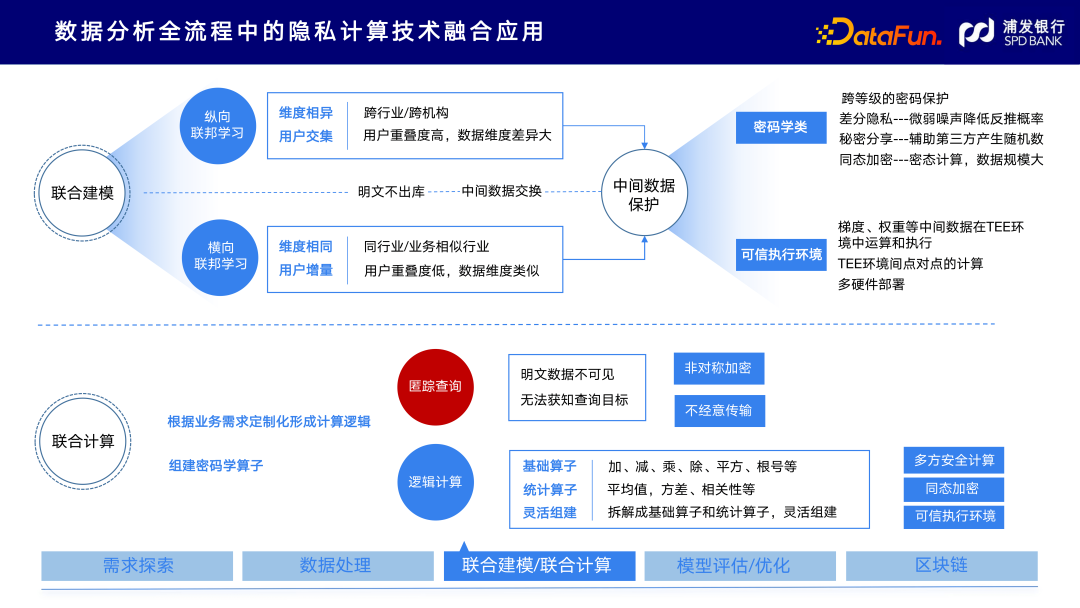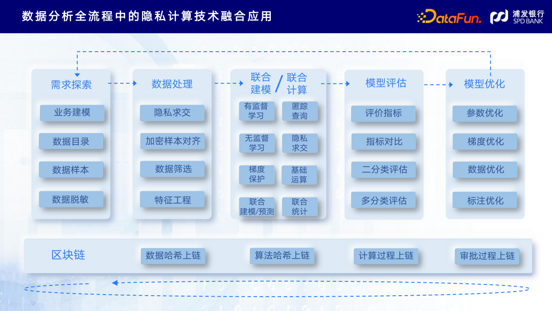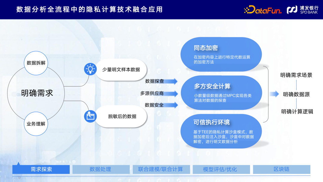 在数据分析的全过程中,不同的技术在限定的前提条件下是可以更好地去发挥它的作用的。接下来我们会从数据分析的需求探索、数据处理、联合建模/联合计算、模型评估/优化,包括隐私计算和区块链的结合去展开。