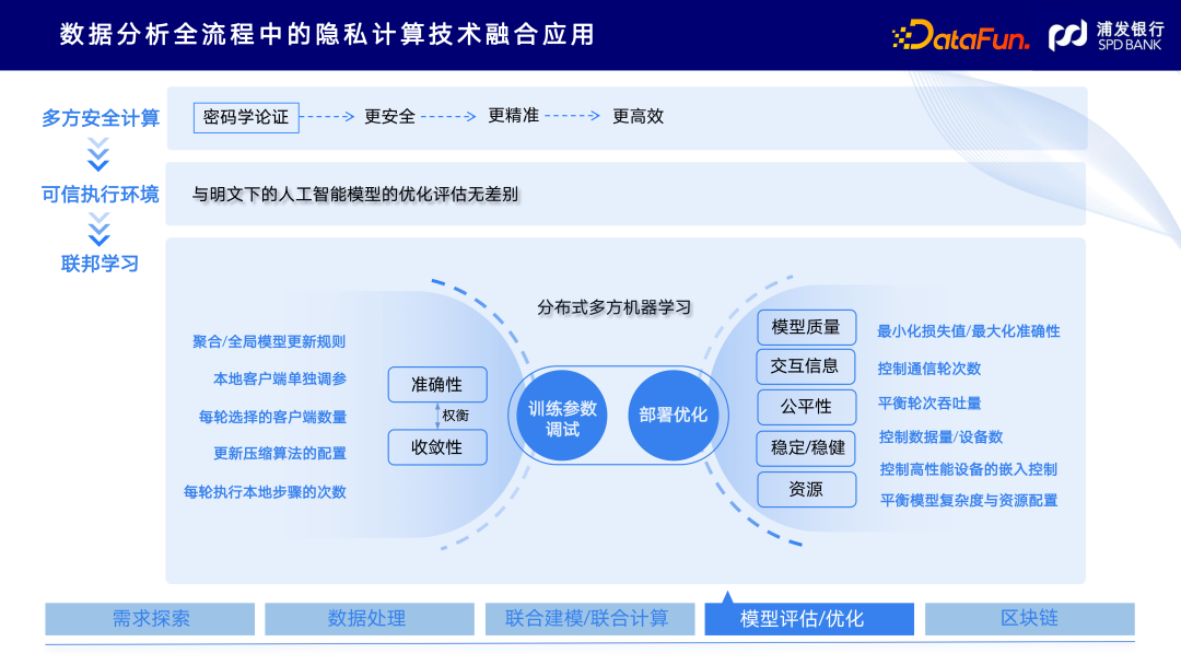 在模型评估和优化的阶段,也会综合运用多项技术。比如用多发性计算,本身就是从密码学的算子上就做到了数据更安全、更高效的改进。用可信执行计算的话,就是由硬件的环境去保证文,与在明文下的人工智能模型上面去做优化评估差别并不是特别大。