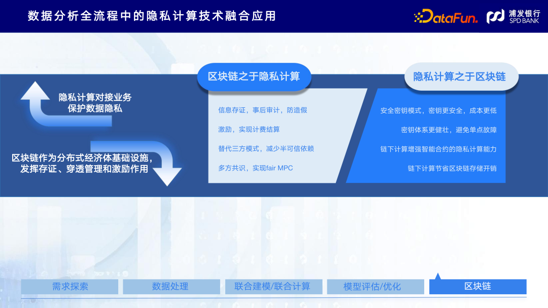所以我们会借助区块链去做一些计算结果的存证,包括各方之间的参与,各方之间的调度,然后去确保整个隐私计算的流程是通过我们确认设计的方式去做相应串接的。这是很关键的一个点。同时我们把这些数据记录下来过后,也可以支撑各方之间激励体系的建设,用于未来各方之间分润等场景。