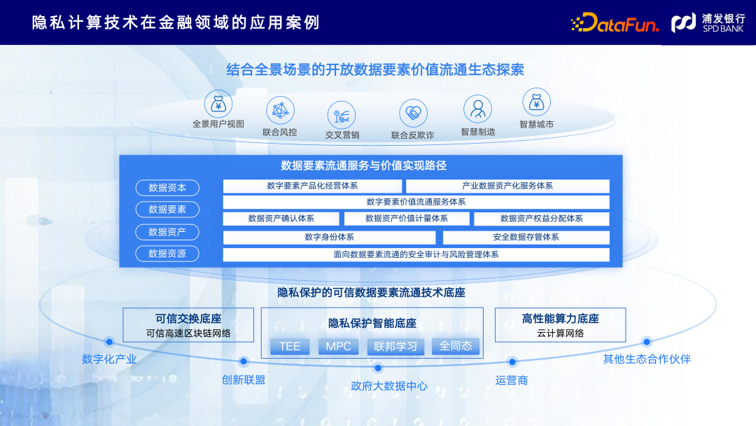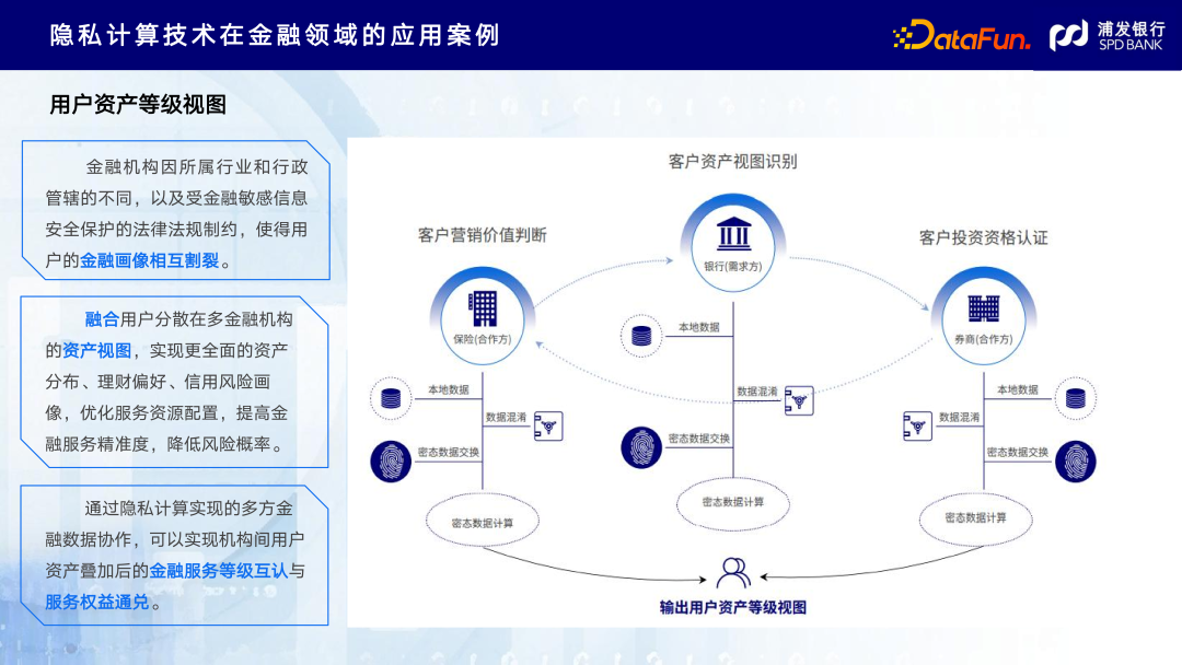 原来我们更多的是以本机构内部的客户数据为中心,但其实这个客户在各个机构都有一些相应的数据。比如代发工资后,你可能会把资金放在股市、基金、理财等地方。当你需要资产证明的时候,如果跨机构的用户资产等级视图的话,就不用将资金挪到一个地方。这样就可以真正的以客户为中心去提供服务。彼此机构之间贡献的数据要引流,要有相应的激励机制。所以其实我们上层是基于MPC能力去实现跨机构的数据资产计算。同时我们底层是和区块链去做结合,然后去明确各方的数据价值的贡献。