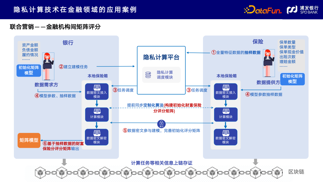 多方之间依托于不管是联邦学习还是MPC,如何去做相应的数据调度,从前面的抽样、调度、建模、计算到后面得出结果。这些过程,我们现在也都是按照这个既有的方式,大家都在尝试。同时我们会把所有的中间一些调度以及非敏感的一些信息,以关键的任务信息进行上链存证。这样保证整个的联合营销的场景设计是按照我们约定的流程去执行的。同时,我们所有参与方之间都可以通过区块链上的这个存证信息去调阅,去确保各方之间的这个信息调用是属实的。