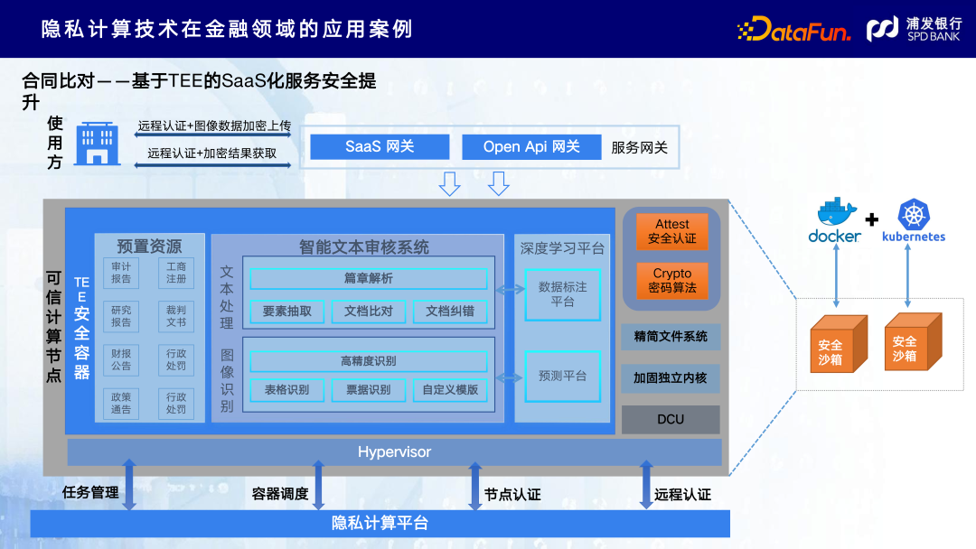 但是我们近期发现一种情况,大家都知道商业合同是一个很敏感的信息,我要用你的SAAS化服务,把合同上传给你的。那我怎么能确保你不去窃取,或者你不去了解我中间的商用的敏感信息呢?但如果我不传给你,又怎么去运用它呢?所以我们结合了安全可信容器的能力,让客户在端侧就把他的数据进行加密了。加密好后,他用密文数据上传到我们的这个SAAS的服务网关上,然后我传到我的隐私计算的平台里面来。它中间有一部分是用这种可信的安全容器在里面去把这个数据解成明文,然后再调用相应的容器去做 OCR 和 NLP 的处理。