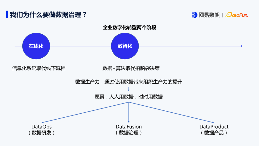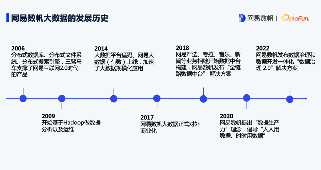 2017年网易大数据开始正式对外商业化。到了2018年,随着网易内部数据分析规模的快速增长,网易在数据分析领域遇到很多问题和挑战,主要表现在数据使用效率、质量、成本和安全领域,面临来自业务的巨大压力,我们开始采用数据中台方式重塑整个数据架构,提出并发布了“全链路数据中台”解决方案。在2020年网易数帆提出了“数据生产力”理念,强调基于数据中台之上,构建面向业务场景的数据产品矩阵,并进一步提炼出“数据产品化”的方法论,这也是数据生产力三大核心方法论之一。大规模的使用数据,加速了对数据治理的解决方案的迫切需求,在2022年,提出了“数据开发和数据治理一体化”理念,这也是网易数帆“数据治理2.0”最核心的内涵。