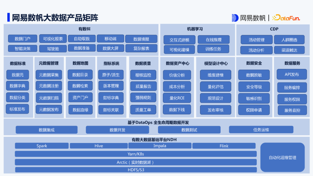 BI是数据分析最重要的窗口,包括做一站式数据门户、自助取数、数据大屏,还有一些通用数据产品,比如CDP等。此外,我们将机器学习平台也放入了数据产品层,主要是在数据之上,能够接入一些智能算法,提高决策的精准性。