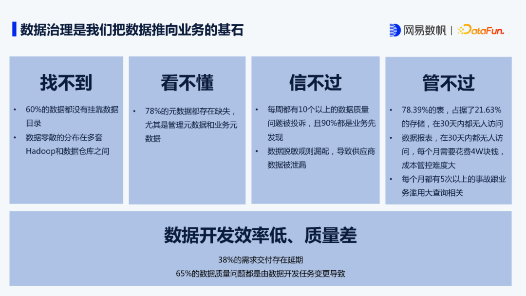 我们把问题归结为:找不到、看不懂、信不过和管不住,其实背后是整个数据生产的效率低和质量差。