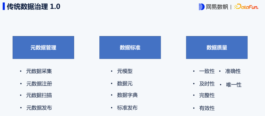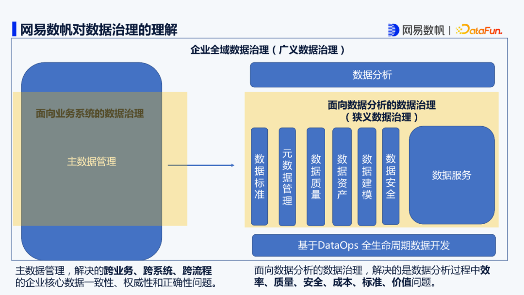 面向数据分析的数据治理:解决的是数据分析过程中效率、质量、安全、成本、标准、价值问题。