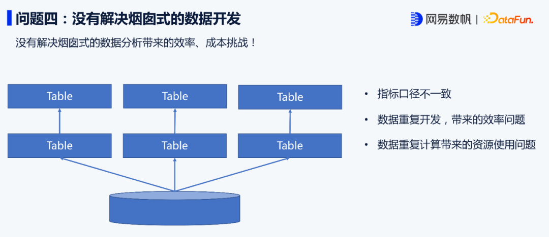 烟囱式的数据开发会造成指标口径不一致,数据重复开发带来的效率问题,以及数据重复计算带来的资源使用问题。