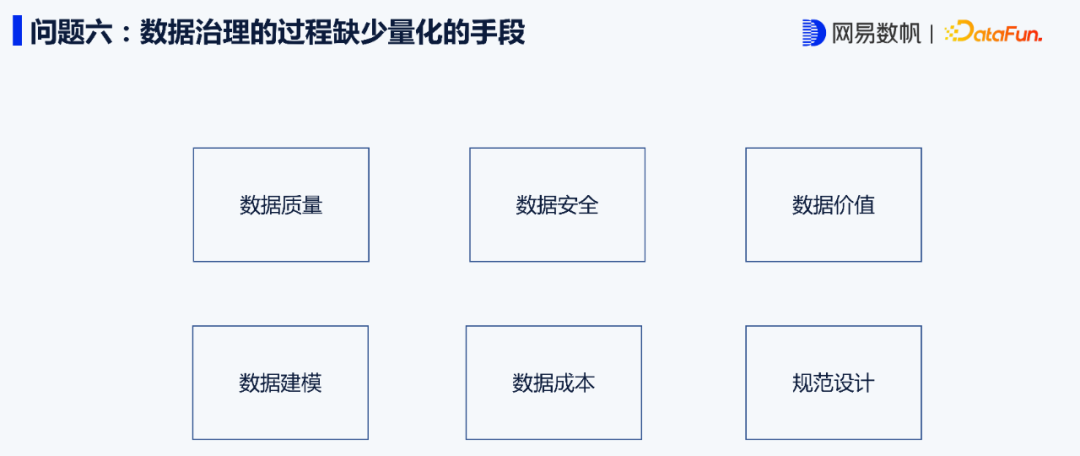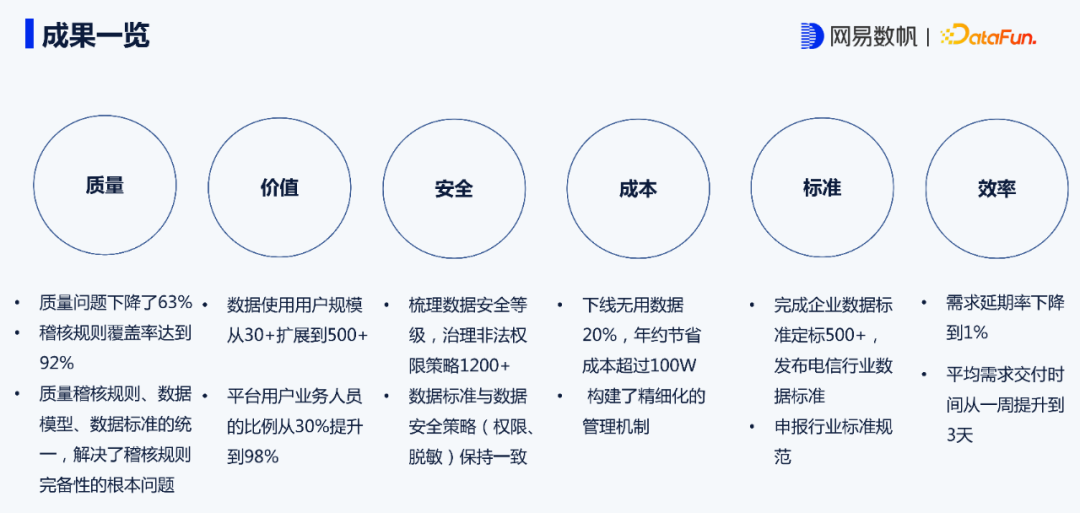 上图展示了我们数据治理的成果。大家也可以从质量、价值、安全、成本、标准和效率这些方面去发现问题。