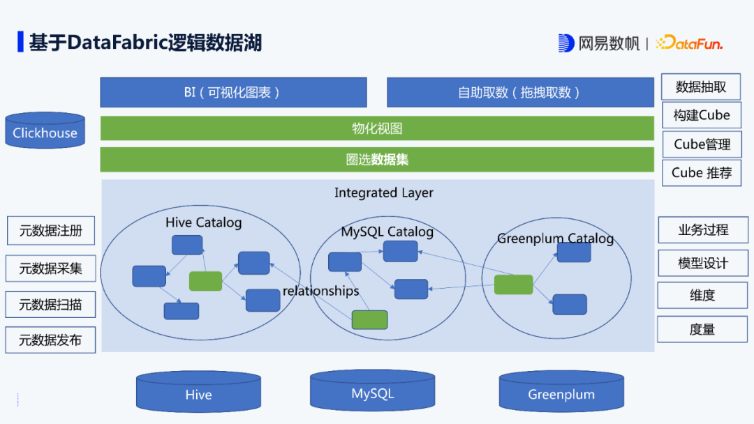 基于DataFabric逻辑数据湖的核心思想是构建一个跨平台的统一的数据集市。把HIVE、MySQL、Greenplum构建统一的聚合层,在此之上直接输送给BI,通过圈选数据集、物化视图完成业务开箱即用的效果,对用户来说,能够屏蔽底层不同数据源之间的数据实现过程。
