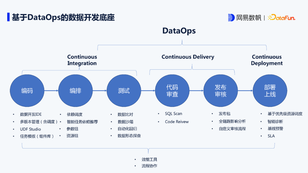 基于DataOps的数据开发底座,是将软件工程中CI/CD的方法论应用于数据开发领域,覆盖了可持续集成和可持续交付、可持续部署。具体包括编码、编排、测试、代码审查、发布审核和部署上线六个阶段。