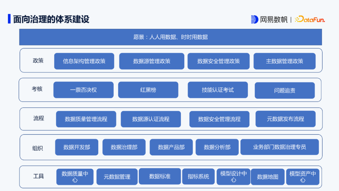技术是数据治理的基础,但有了技术还不够,还需要上面的组织、流程、考核以及政策,完善整个体系,才能最终实现人人用数据、时时用数据的愿景。
