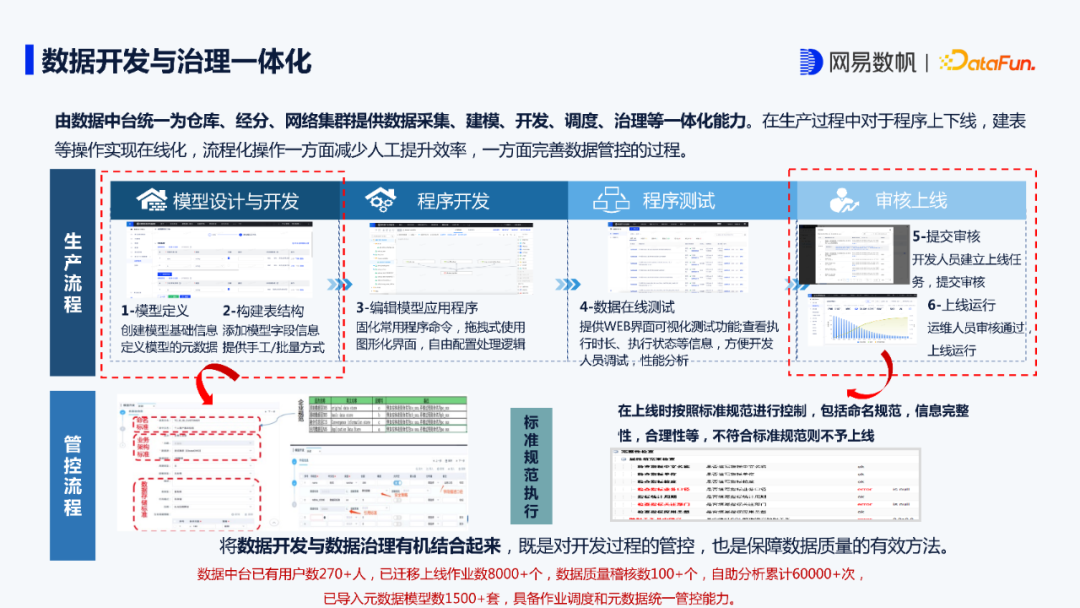引入网易数帆,由数据中台统一为仓库、经分、网络集群提供数据采集、建模、开发、调度、治理等一体化能力。在生产过程中对于程序上下线,建表等操作实现在线化、流程化操作,一方面减少人工提升效率,一方面完善数据管控的过程。