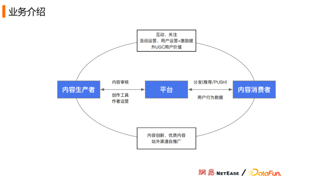 网易从门户网站到新闻客户端,我们的目标是让用户在短时间内去中心化地获取内容信息。整体的业务流程可以简单理解为:内容生产者生产内容,平台负责分发,用户去消费这些内容。
