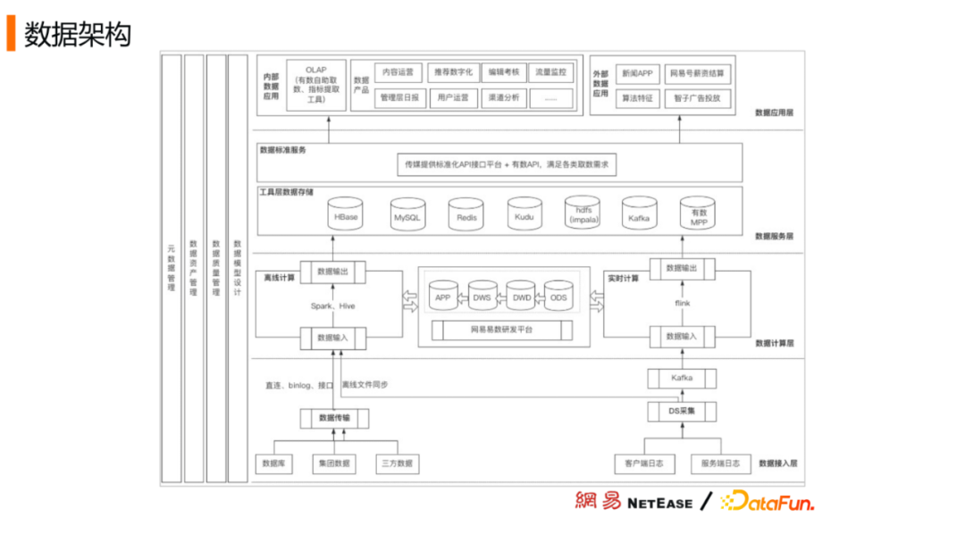 数据服务层:包括两部分,一部分是数据工具层的存储,另一部分是数据标准服务,我们标准化、统一化了数据输出。