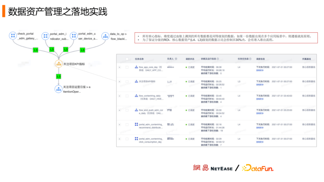 第二步,落地执行:数据是从业务系统中产生的,然后经过同步工具进入到数仓,最后再通过同步工具输出到数据产品中进行消费。不同的数据产品划分等级,再根据数据的血缘关系打上资产等级标签,不同等级采取相应保障措施。核心资产的占比会控制在30%以内,同时会有准入准出的一个严格的审核流程。通过数据资产等级体系,确定了四个资产等级,36个核心数据报表,153个核心的数据生产任务。